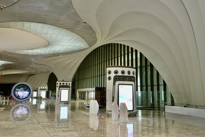 The terminal architecture draws inspiration from the lotus, with sculptural petals and sweeping lines that blend tradition with modern minimalism. Inside, the airport emphasizes digital automation, biometric systems, virtual queuing, smart baggage handling, and seamless passenger flows — making it India’s first fully digital airport in many respects.